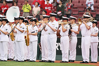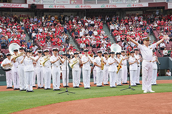 また前日6日(金)には、1956年に創設以来、広島県下をはじめ、近畿・中国・四国・九州東部において演奏活動を行っている「海上自衛隊 呉音楽隊」による国歌演奏が行われました。音楽隊の皆さんが奏でる美しい音色に、スタンドから大きな拍手が送られました。