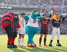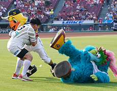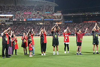 試合前は、「マツダスカイアクティブズ広島」の芦田朋輝選手、大竹智也選手がグラウンドに登場!マスコットキャラクターの「ウィズリー」と、ハリーホークとスラィリーも参加し、迫力のあるウォーミングアップパフォーマンスを披露しました。