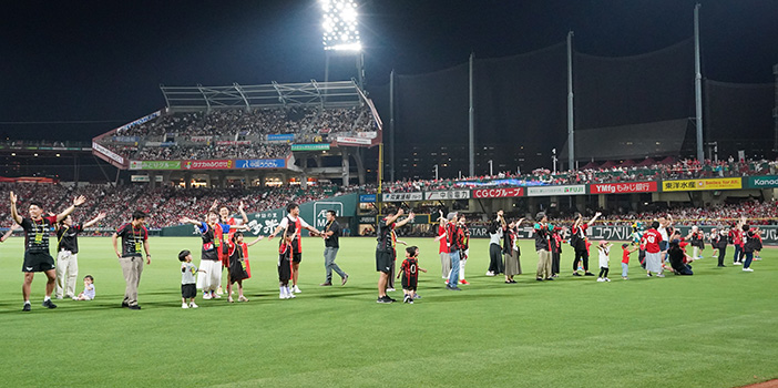 5回裏終了時は、外野グラウンドにて「マツダスカイアクティブズ広島」の選手・スタッフ、マスコットキャラクター「ウィズリー」等がCCダンスに参加!元気いっぱいにダンスを披露しました!
