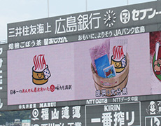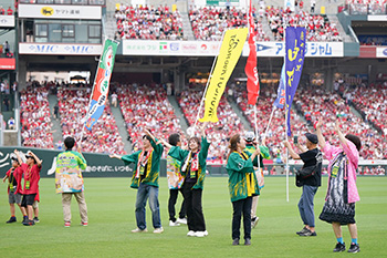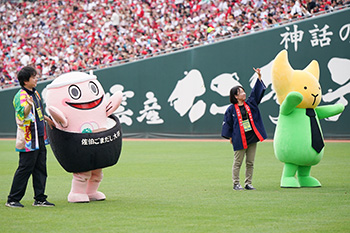 5回裏終了時は、外野グラウンドにて湯布院、佐伯、大分県「広島東洋カープ支援交流事業団」の皆さんと、由布市公式マスコットキャラクター「ゆーふー」、佐伯ごまだしうどんイメージキャラクター「佐伯ごまだし大将」がCCダンスに参加!旗を振って大分県をPRしながら元気いっぱいにダンスを疲労しました。