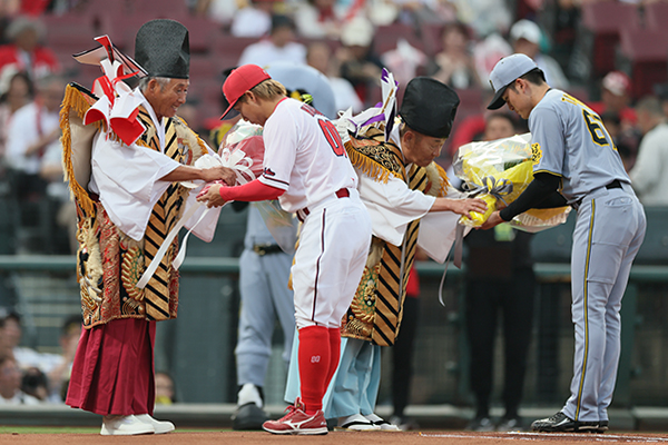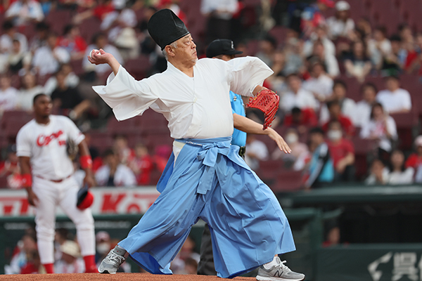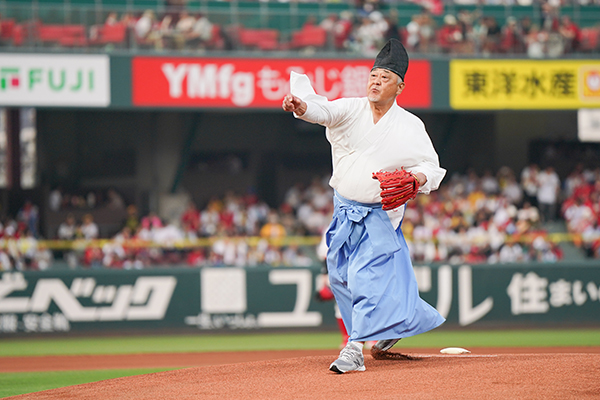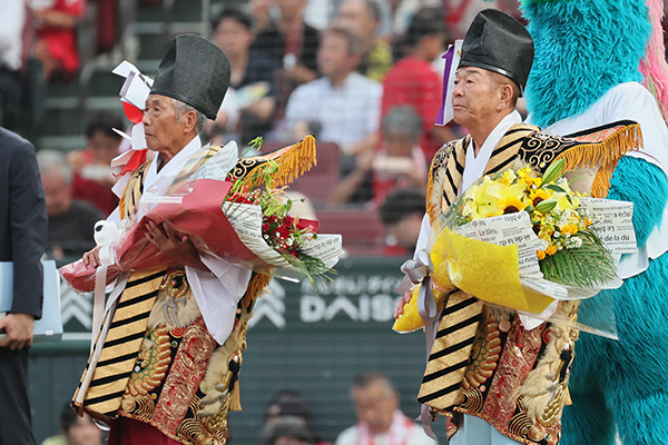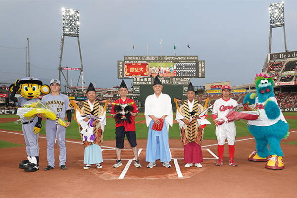 7月10日(水)阪神戦にて、広島県を代表する伝統芸能「神楽」の里である、北広島町、安芸高田市、安芸太田町の全ての神楽団が集まった「ひろしま芸北神楽協議会連携会議」の皆様がご来場され、「ひろしま芸北神楽PRイベント」を開催しました。
