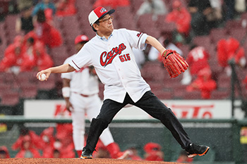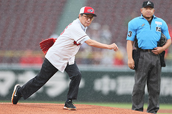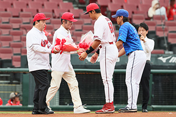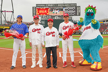 試合前は、中本県議会議長、八条市議会議長による花束の贈呈式と、松井広島市長による始球式が行われました。