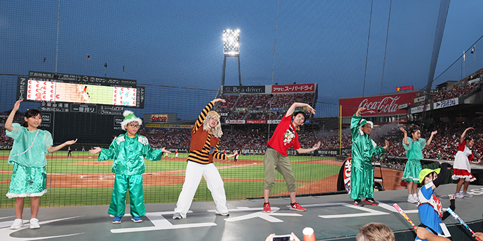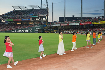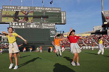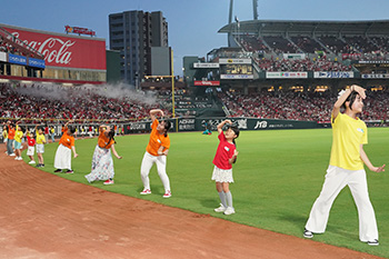 5回裏終了時は、外野グラウンドにて庄原こどもミュージカルの皆さんがCCダンスに参加!マイクで直接あいさつをした後、暑さにも負けない元気いっぱいのダンスを披露しました!