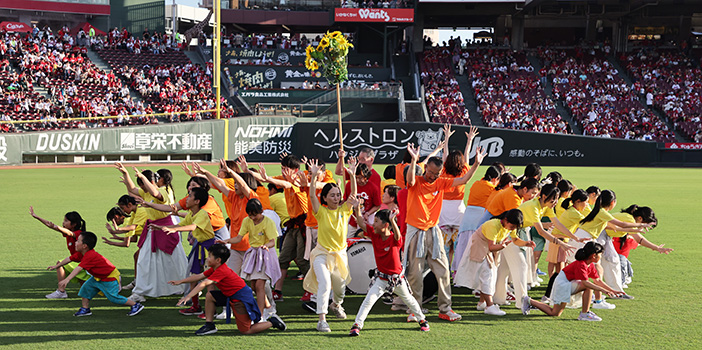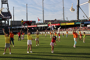 試合前は外野グラウンドにて、庄原こどもミュージカルの皆さまによるダンスパフォーマンスが行われました。