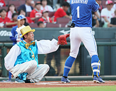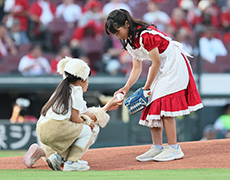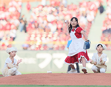 また、庄原こどもミュージカルの今年の演目「オズの魔法使い」より、「ドロシー役」の菱絢音さん、「トト役」の竹原ゆかりさんと宮本理菜さん、そして「オズ」に扮した八谷恭介庄原市長が始球式に登場。可愛らしい姿に場内からはあたたかい拍手が送られました。