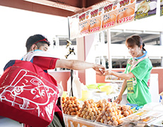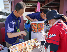 ライト側コンコース どうぶつ広場、レフト側コンコース レフト広場の両広場では、庄原市自慢の特産品が大集合!中でも肉の塊を炭火で焼いた「庄原アサード」は試合開始後すぐに完売するほど大人気でした。その他、芸備線を走る電車のカプセルトイや庄原ファンクラブの入会募集も行い、庄原の魅力をPRしました。