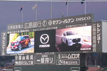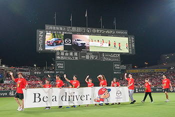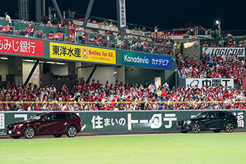 5回裏終了時は、「MAZDA CX-80/アーティザンレッドプレミアムメタリック」と「MAZDA CX-60/ジェットブラックマイカ」がグラウンドを走行!横断幕を持ったパレード隊も参加し、スタンドの皆さまに元気よく手を振りながらマツダ車をPRしました。