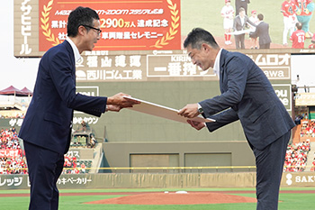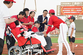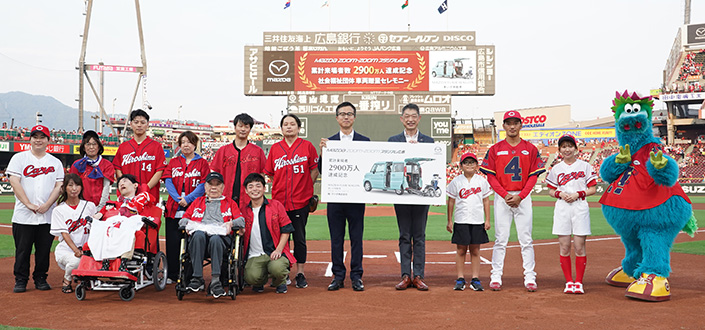 試合開始前には、マツダ スタジアムの累計来場者が2,900万人を達成したことを記念し、社会福祉法人 三篠会様に、「MAZDA FLARE WAGON 車いす移動車」が贈呈されました。