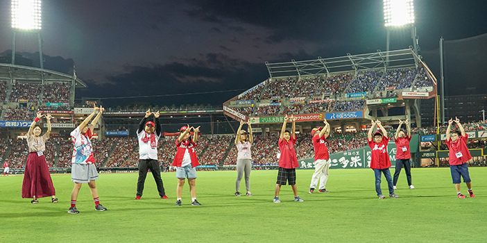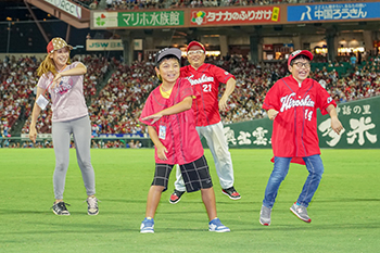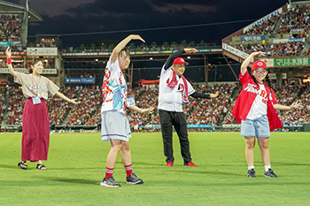 5回裏終了時に外野グラウンドにて親子でCCダンスを披露!スラィリーからのレクチャーも受け、暑い中でも笑顔で元気よく踊り切りました。