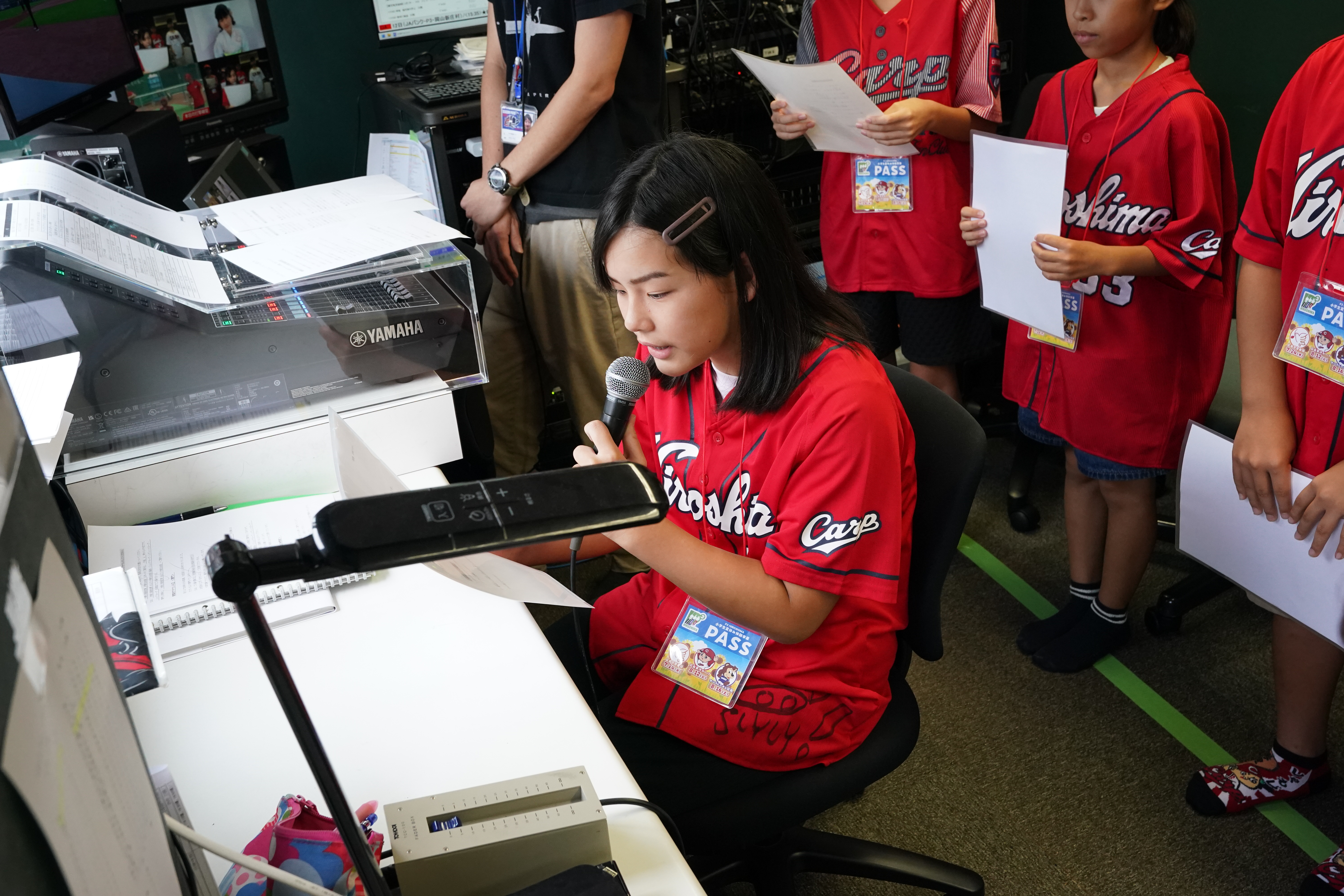 試合前には、いつもウグイス嬢がアナウンスしている場所で、場内アナウンス体験を行いました。