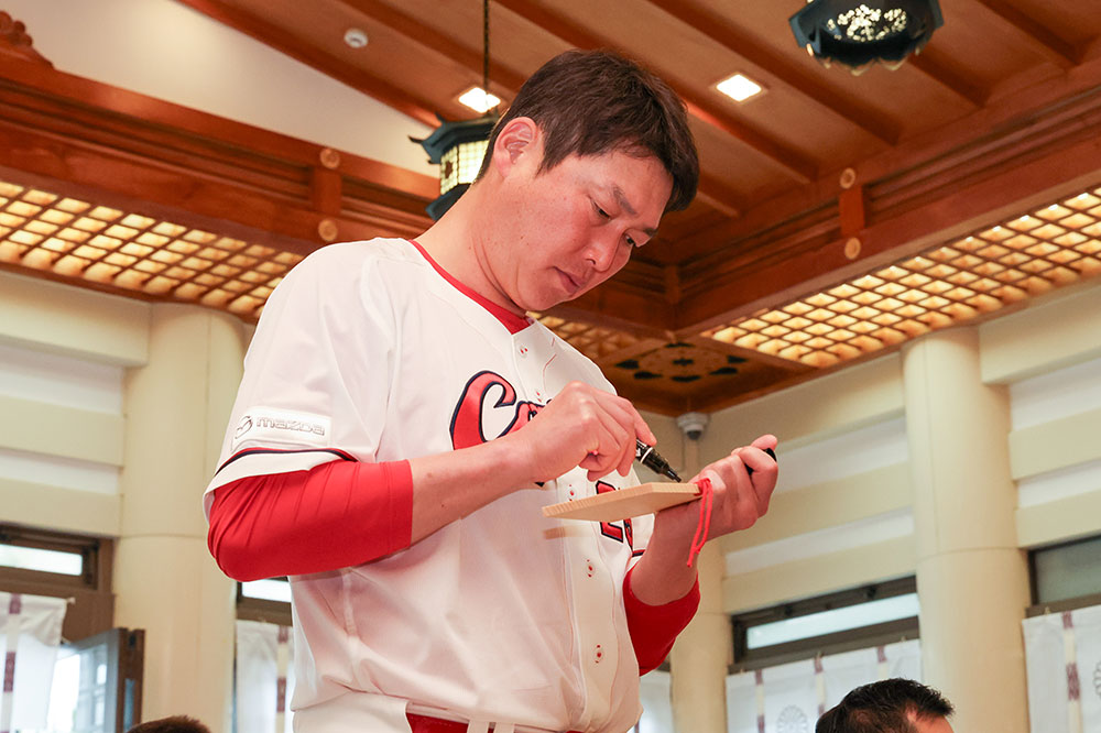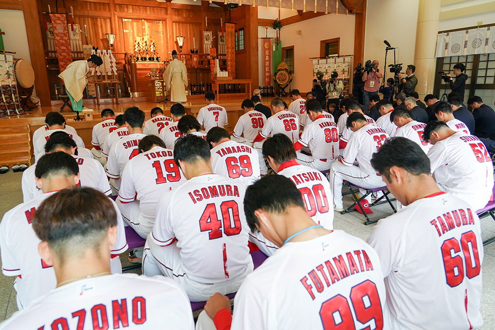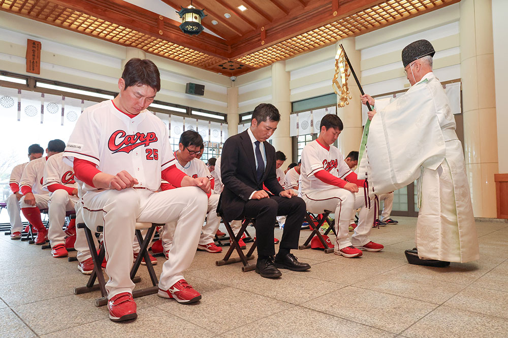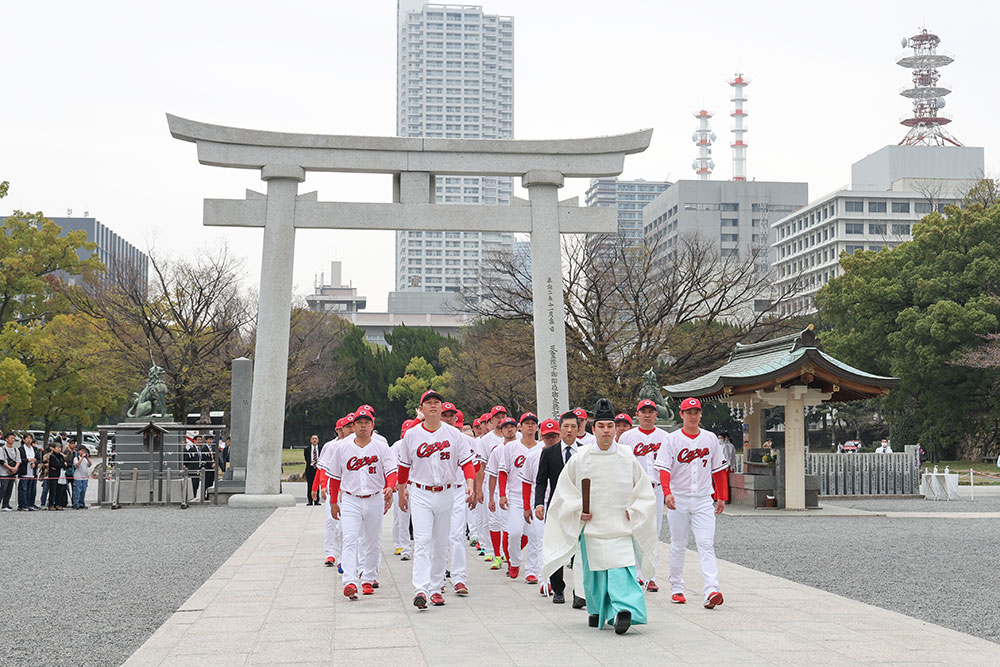 3月28日(金)から開幕するプロ野球ペナントレース。開幕を目前に控え、オーナー代行、新井監督、コーチ、選手たちが広島護国神社へ参拝し、必勝を祈願しました。