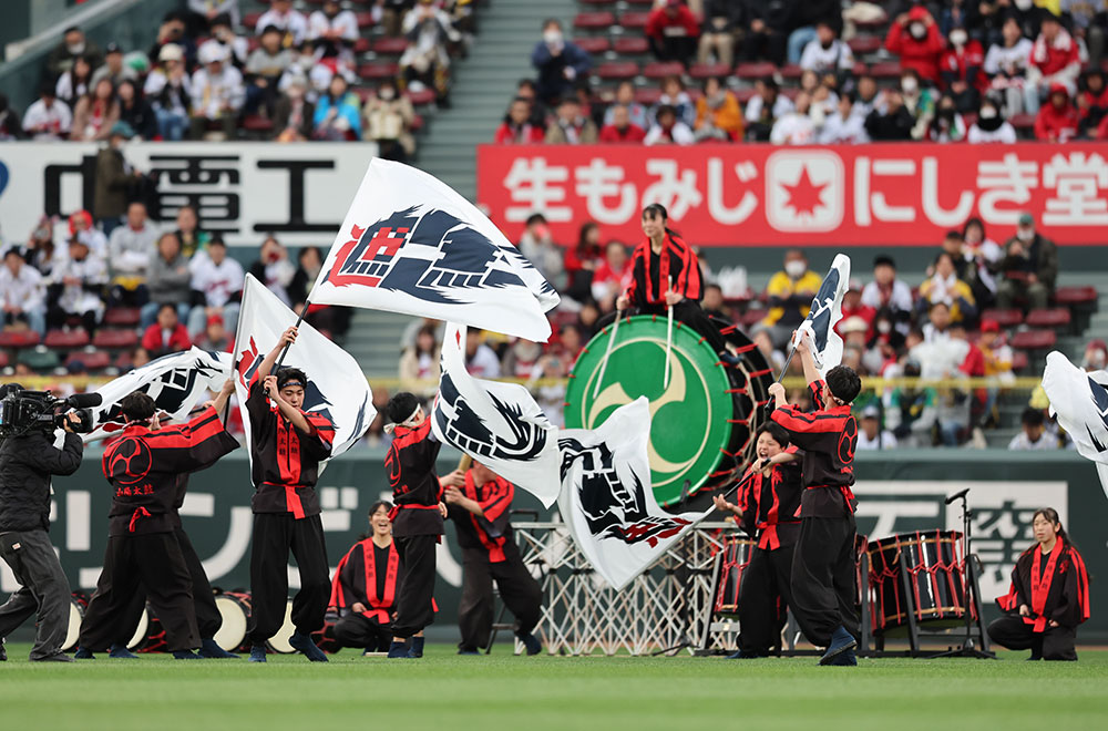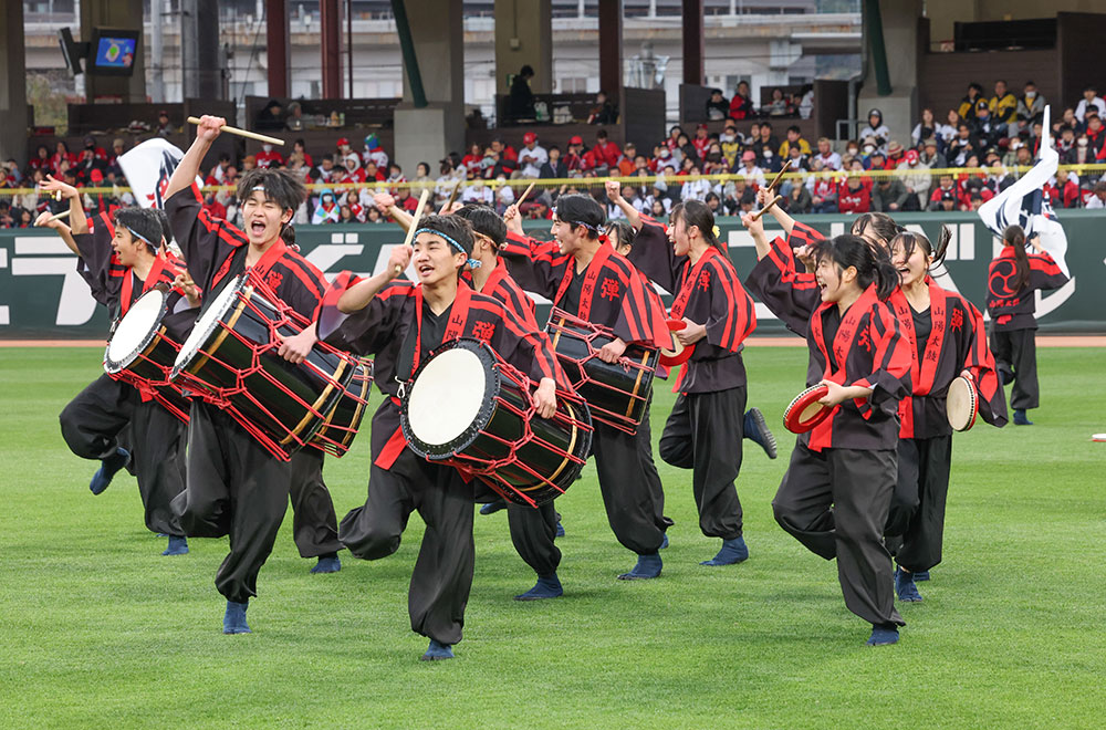 セレモニーは山陽高校和太鼓部「弾」によるオープニングアトラクションからスタート!!迫力ある和太鼓の演奏と旗にデザインされたキャッチフレーズ「遮二無二」の鯉が力強く躍動し、直前に迫る開幕戦への雰囲気を盛り上げました。