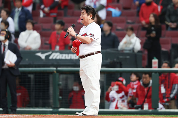選手入場後には、「それ行けカープ」が今年で50周年を迎えることを記念して、オリジナル歌唱者の『塩見 大治郎さん』に国歌独唱を務めていただきました。カープ愛あふれる姿で力強く独唱を務めていただき、開幕戦に向けたスタジアムの機運が更に高まりました。
