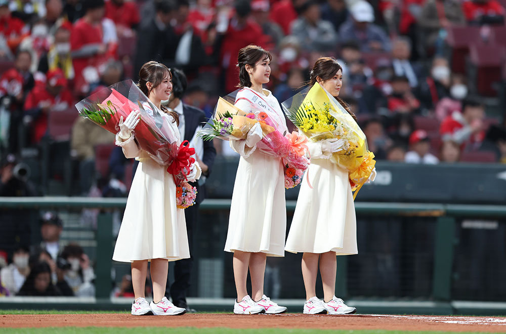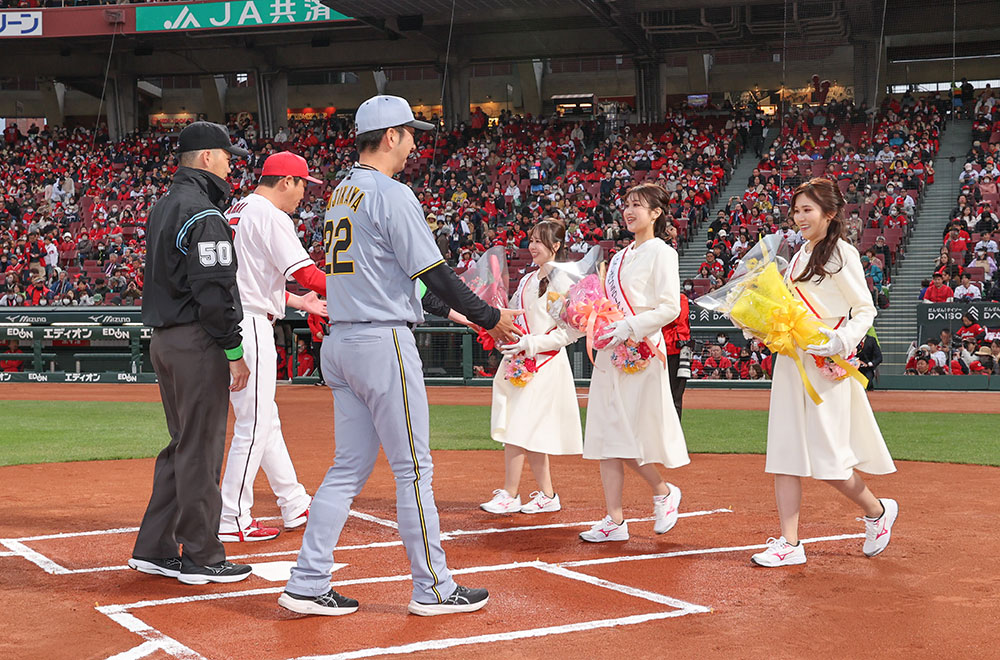 また、1975年カープ初優勝後に行われた「優勝パレード」がきっかけとなって始まり、今年もゴールデンウイーク5月3~5日に開催される「広島と世界を結ぶ平和の花の祭典 2025ひろしまフラワーフェスティバル」のPRを務めるフラワーアンバサダーの大上 くるみさん、 長田 知紗さん、大段 利々子 さんより、両チーム監督、審判団へ花束が贈呈されました。