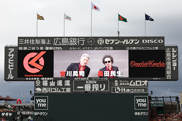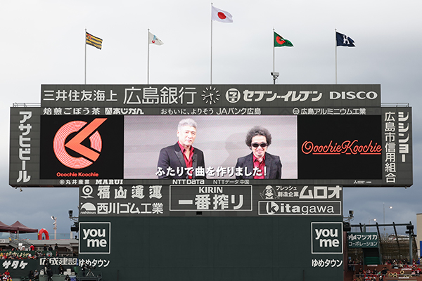 続いてオープニング映像が放映され緊張感が徐々に高まる中、サプライズで奥田民生さん・吉川晃司さんによる新ユニット「Ooochie Koochie(オーチーコーチー)」からの応援メッセージと、カープの応援歌「OK」(オーケー)の制作が発表されました。