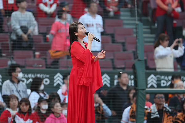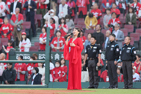 4月11日(金)対 巨人戦の試合前に行われた国歌斉唱は、福山市出身で2004年のデビュー後、2005年発売のシングル「百万本バラの街福山」が福山市イメージソングに推奨され、2020年、2023年にはミニアルバムをリリースされたほか、CMや全国のよさこい等のボーカルも行う傍ら単独ステージとしてポップス、歌謡曲まで幅広いレパートリーで活動中の歌手 希元 奈央 さん に務めていただきました。