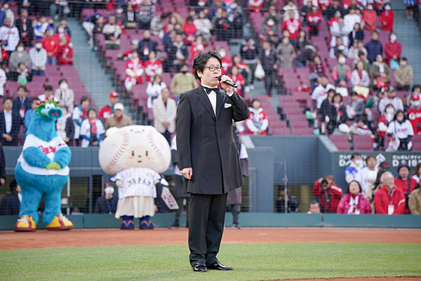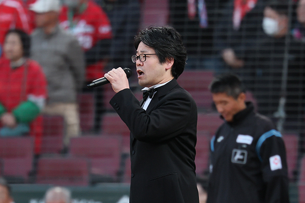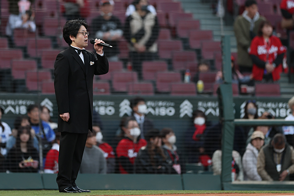 4月15日(火)対 中日戦の試合前に行われた国歌斉唱は、広島県出身で、崇徳高校、国立音楽大学を卒業後、オペラ出演や第50回記念福山音楽祭など各種演奏会への出演、第14回宮日音楽コンクール声楽部門入選を経て、現在では崇徳学園や広島市立早稲田中学校などでの非常勤講師を務めながらテノール歌手としての活動のほか、指揮者や合唱指導者としてもご活躍中の 森﨑 皓 さん に務めていただきました。