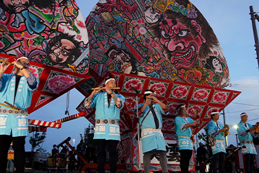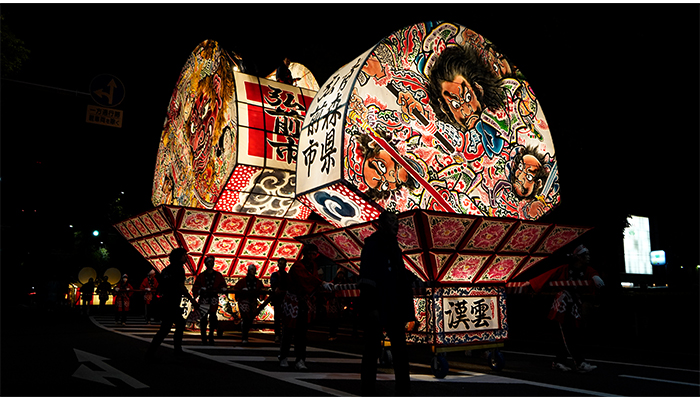 青森県弘前市の夏の夜空を彩る弘前ねぷたまつりは、三国志や水滸伝などを題材にした勇壮で色鮮やかな武者絵が描かれた扇ねぷたや、組ねぷた大小合わせて総数約七十台が、ヤーヤドーの掛け声と共に市内を練り歩く、昭和五十五年に国の重要無形民俗文化財に指定され、300年以上の歴史を誇るまつりです。(まつり会期:毎年8月1日~7日)