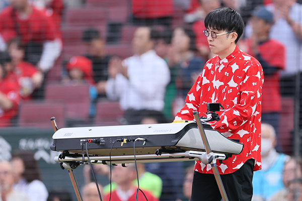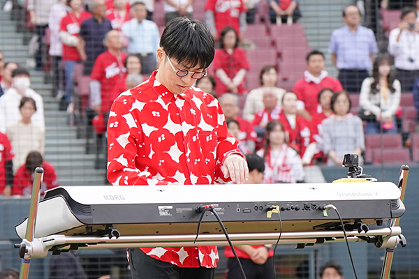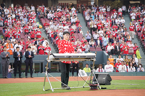 5月13日(火)対 巨人戦の試合前に行われた国歌演奏は、オランダ・アムステルダムや、ドイツ・ベルリンで研鑽を積まれ、イタリアでの18th Citta di Valentino International Competitionで第1位を受賞されたほか、スロヴァキア国立歌劇場 管弦楽団とのピアノ協奏曲での共演など、国内や世界各国で演奏活動を行われている福山平成大学教授、ピアニストの 伊藤 憲孝 さん に務めていただきました。