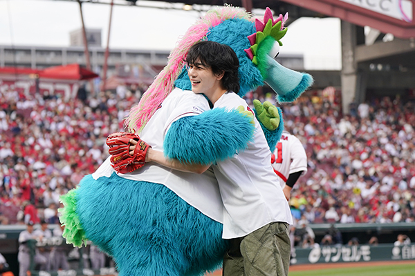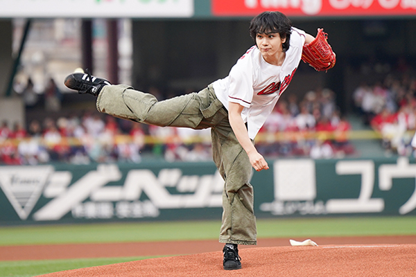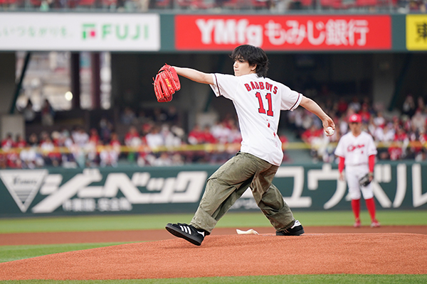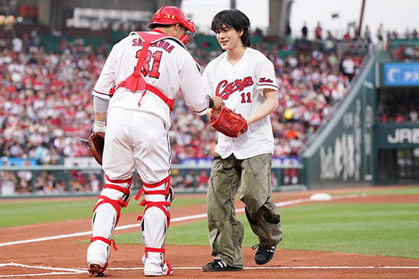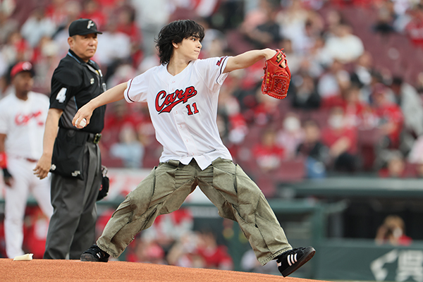5月14日(水)対 巨人戦の試合前に行われた始球式は、今年で結成5周年のグローバルボーイズグループ「JO1」のメンバーとしてNHK紅白歌合戦に3年連続で出場され、今年の2月から3月には世界6都市のワールドツアー、4月にはグループ初の単独東京ドーム公演を開催し、LAドジャー・スタジアムでもパフォーマンスを行うなど、国内外でも勢いを落とすことなく活躍の幅を広げられているほか、5月30日(金)に劇場公開予定の「BADBOYS -THE MOVIE-」では映画初主演となる主人公 桐木 司 役を熱演されている 豆原 一成 さん に務めていただきました。