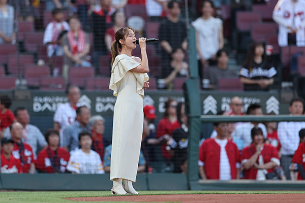 6月17日(火)対 ソフトバンク戦の試合前に行われた国歌斉唱は、自ら命名したハワイ語で「太陽」と「声」の意味をもつ名前で2016年にメジャーデビュー後、テレビドラマ・舞台への出演や楽曲のテレビCM起用のほか、楽曲「RED」が坂倉選手の登場曲に起用されるなど、ご活躍中のシンガーソングライター Leola さん に務めていただきました。
