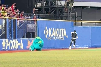 …惜しくも転倒してしまいましたが、意外な俊足に球場全体から驚きの声が上がっていました!