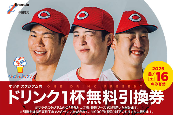| 実施内容 | 「ぐっとずっと。ドリンク」のクーポンをご提示いただいた方に、 当日球場内の「どうぶつ広場」特設ブースで利用できる、 『ドリンク1杯無料引換券』とカープコラボクリアファイルをプレゼント! ![]() ≪ドリンク一杯無料引換券≫ ![]() ≪カープコラボクリアファイル≫ ※「ぐっとずっと。ドリンク」の会員登録およびお支払い情報の登録が必要です。 ※『ドリンク1杯無料引換券』は、ビールもしくはソフトドリンクに交換可能です。 |