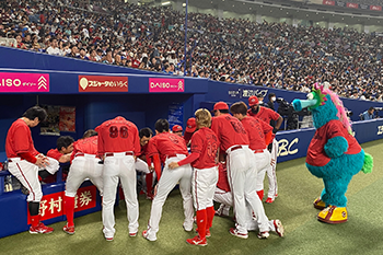 広島から持参した30周年記念デザインのタオルを、バンテリンドームに詰めかけたカープファンの皆さんにお届けしました!
