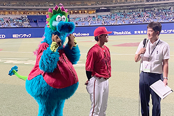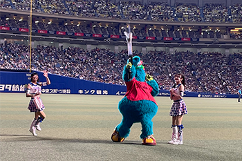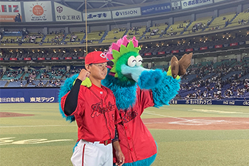 勢いよくグラウンドに飛び出すと、力強い鯉のぼりさばきでファンの皆さんと一緒にチームにエールを送りました!