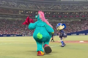 その後はダンスコンテスト「踊り王」の時間にも登場!…したのですが、なぜかドアラの手にはスラィリーのユニフォームが!