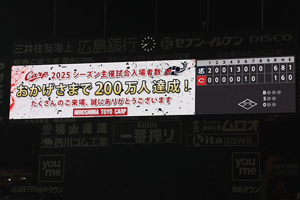 本日、10月3日(金)ヤクルト戦にて、今季主催ゲーム総入場者数が2,009,488人となり、200万人を達成いたしました。 今シーズンもたくさんのご来場、誠にありがとうございます。 ペナントレースも残り1試合となりました。最後まで、温かいご声援よろしくお願いいたします。
