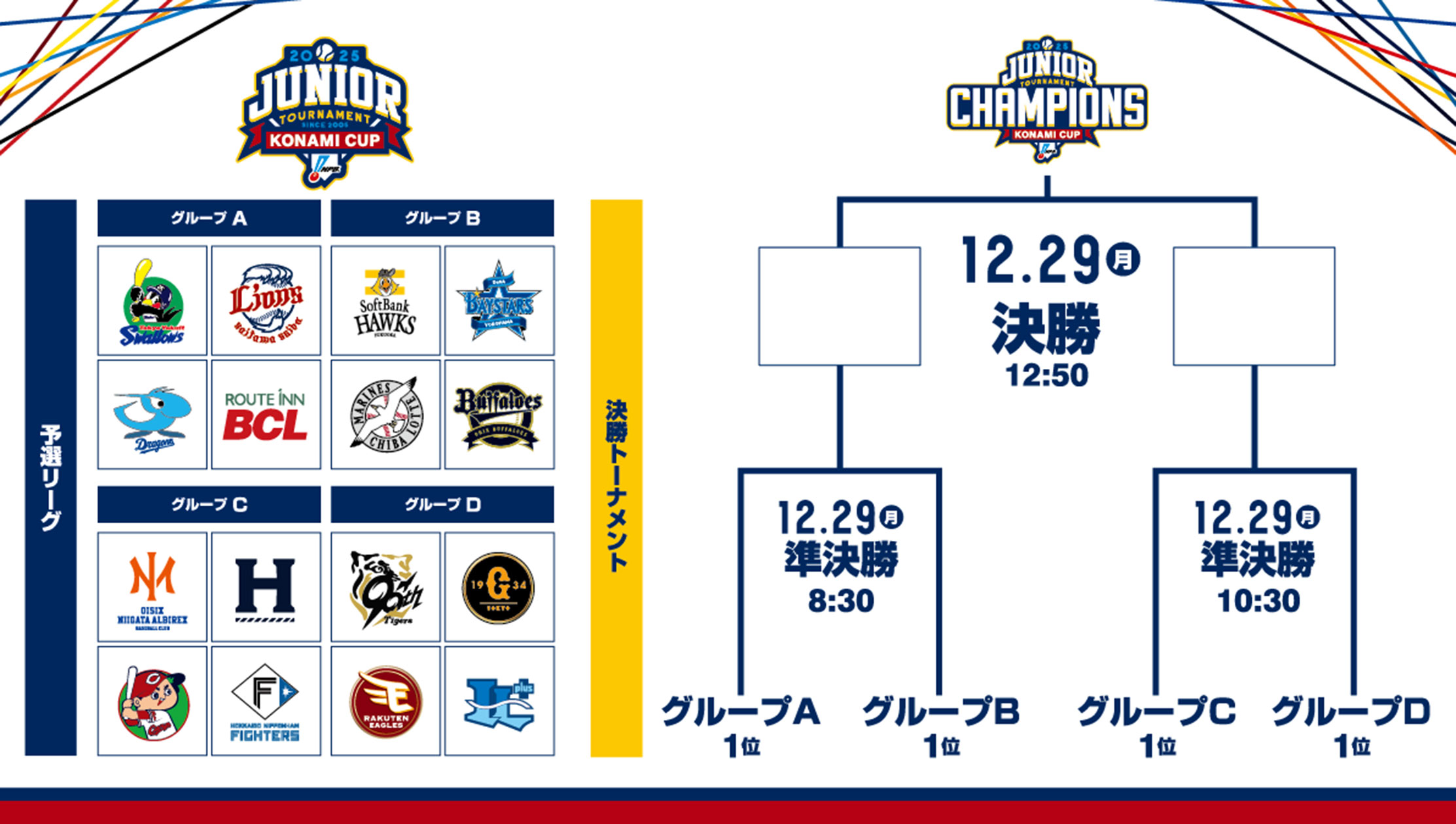 12月26日(金)~12月29日(月)に明治神宮野球場および横浜スタジアムで開催される「NPBジュニアトーナメントKONAMI CUP 2025」の対戦カードが決定しました。