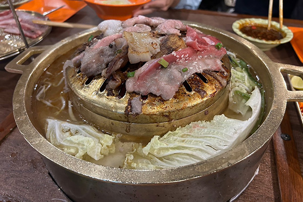 真ん中が盛り上がった鍋で焼き肉をしながら、周りの溝に出汁を入れ、野菜を煮込んで鍋のように楽しむことができる料理です!焼いているお肉から肉汁が出汁に入っていくので、お肉の旨みを余すところなく味わえました!