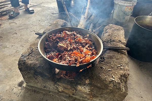 染色は自然の染料を使用しているとのこと。今回は茶色の染料を使用しましたが、なんと玉ねぎの皮を煮込んで作った染料だそうです!