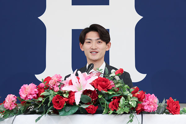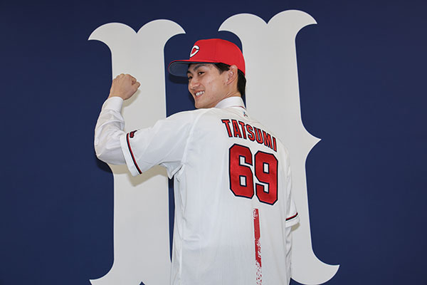 本日、現役ドラフトで加入した辰見鴻之介選手の入団会見を行いました。背番号は69です。