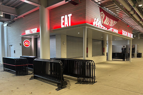 また、スタジアム内には地元の飲食店が多数お店を構えており、地域との強い繋がりを感じることができました。専用アプリを利用すれば観客席から注文が可能。並ばずに受け取ることができ、地元の食事を楽しめる工夫がされていました。特別なカメラを設置することで、無人で物品の購入が可能なお店もあり、IT技術も活用した最先端のスタジアムである印象を受けました。